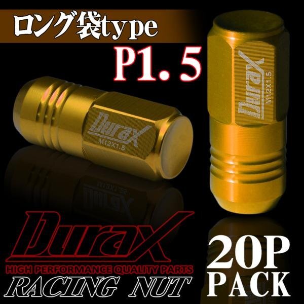 > DURAX製 ホイールナット アルミナット ロング袋ナット 50mm レーシングナット 20個 金 ゴールド P1.5 長袋型 トヨタ ホンダ 150KLF