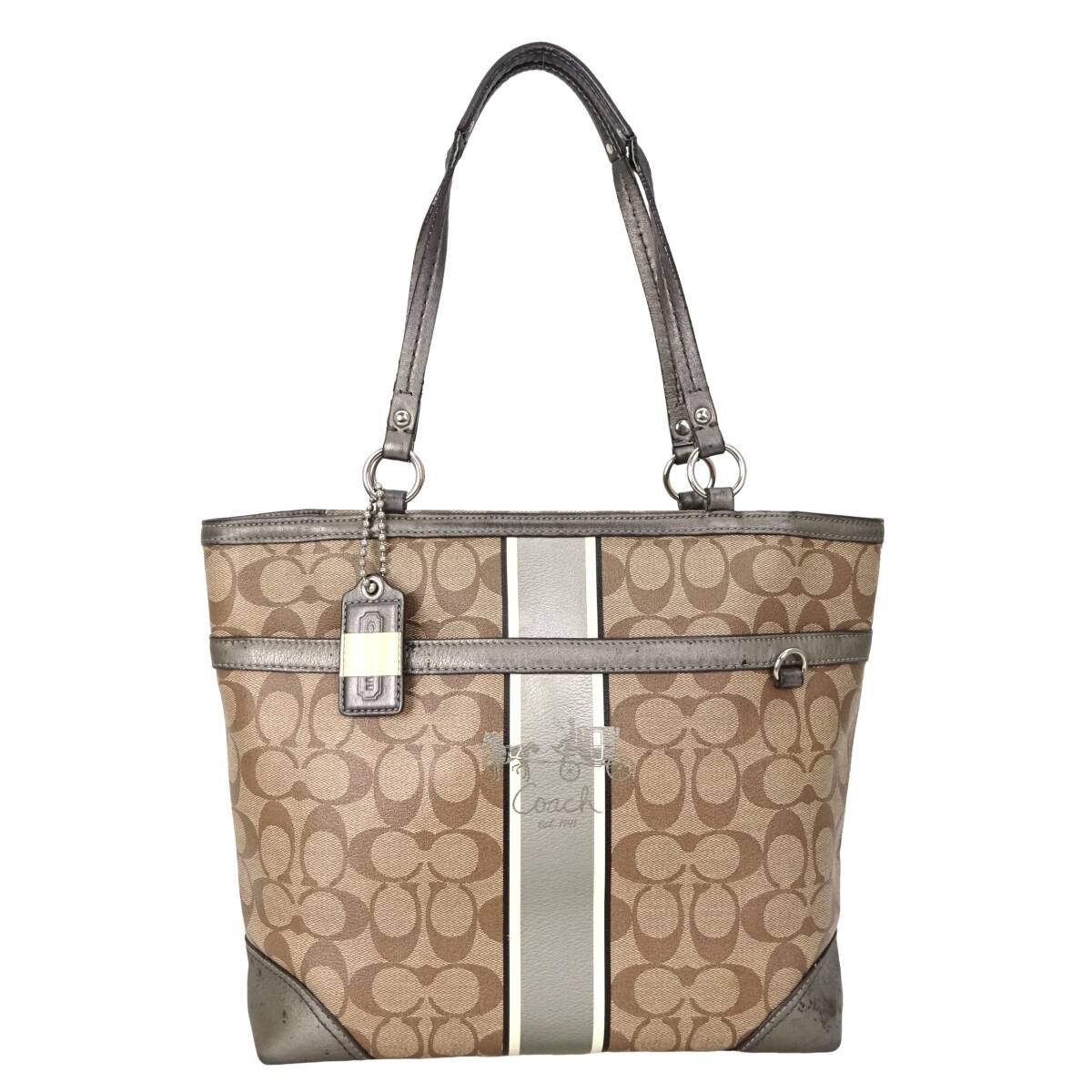 - 本物■コーチ■シグネチャー ヘリテージ ストライプ トート ベージュ ガンメタ ショルダートートバッグ ハンドバッグ /920401