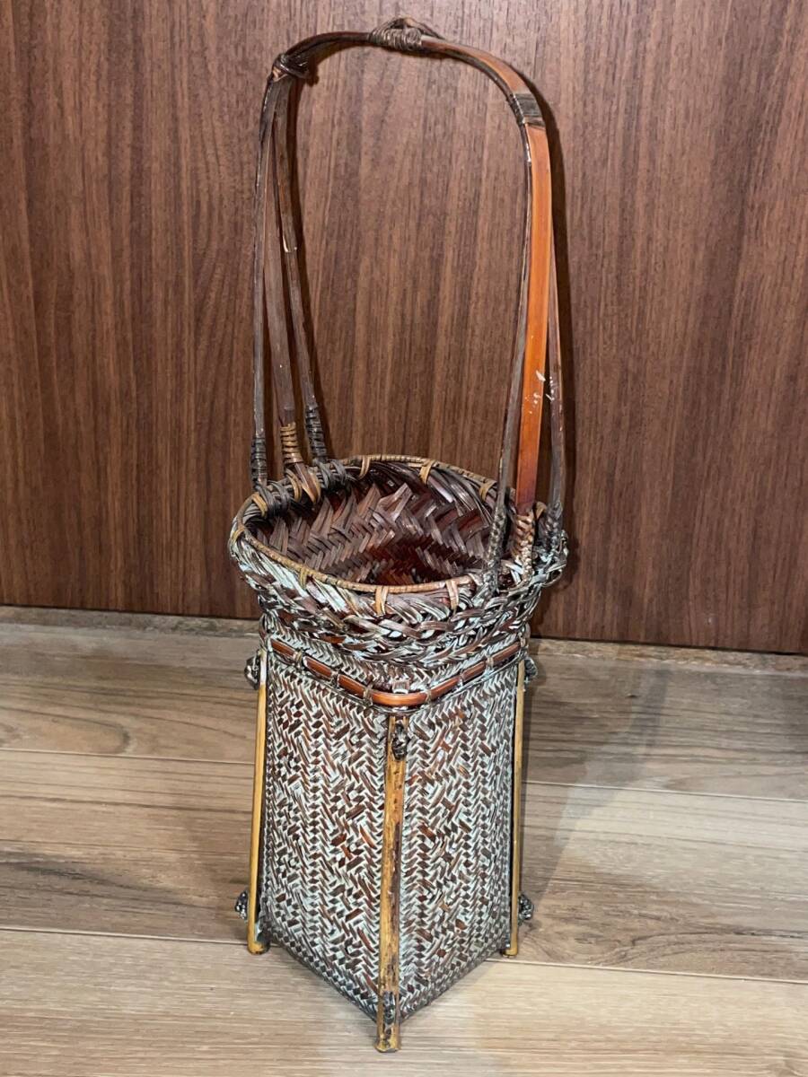 - 花入れ 花瓶 花器 持ち手付 一輪挿し 茶室 床の間 竹製 竹籠 竹細工 一輪挿し かご花入れ 茶道具 昭和レトロ 調度品 和風