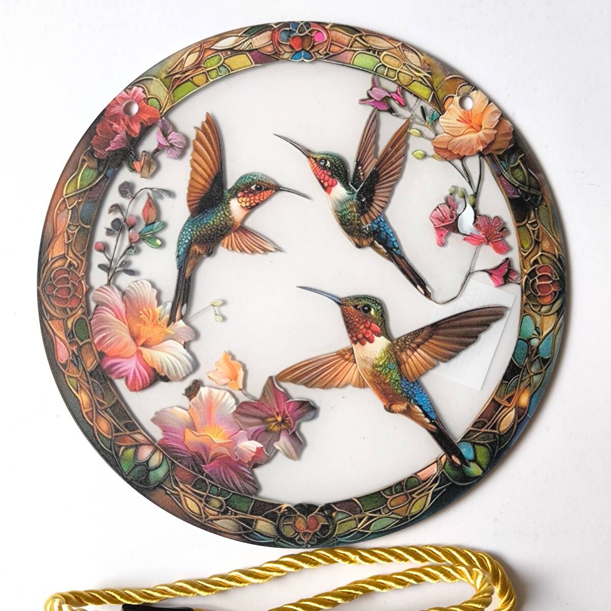 - 【ハチドリと花のカラフルなステンドグラス風】アクリルプレート 飾り サンキャッチャー 紐付き オブジェ お洒落 壁や窓辺の飾りに◎