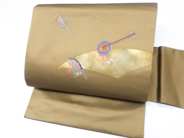 - 《京都一輝堂》【着物】九寸名古屋帯 金糸 金彩 古典楽器文 太鼓柄 25b04-758
