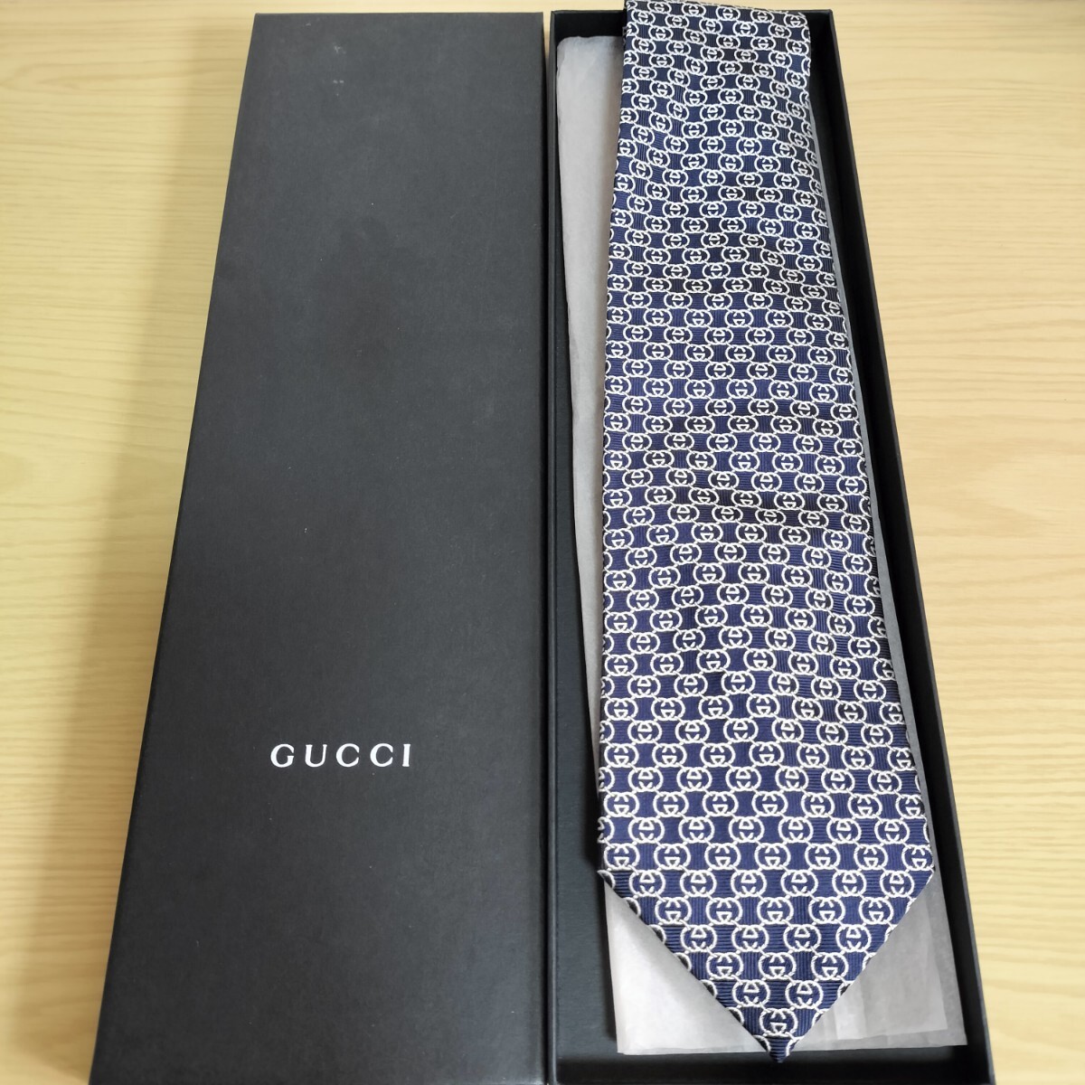 - グッチ(GUCCI)ダーク紺色インターロッキングGG模様ネクタイ