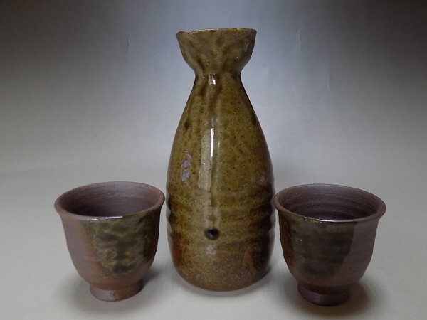 - ★tb46★丹波立杭焼 作者不詳 徳利(無銘)1本・酒杯(在銘)2客★