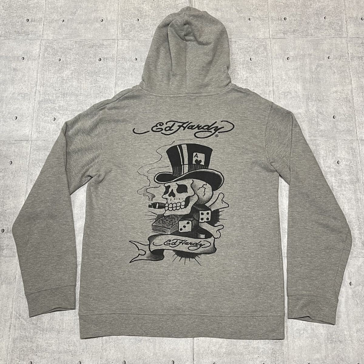 > Ed Hardy フーディー 両面プリント パイル裏地 ゆるダボ エドハーディー パーカー フーデッド 大きいサイズ XL グレー 早6035
