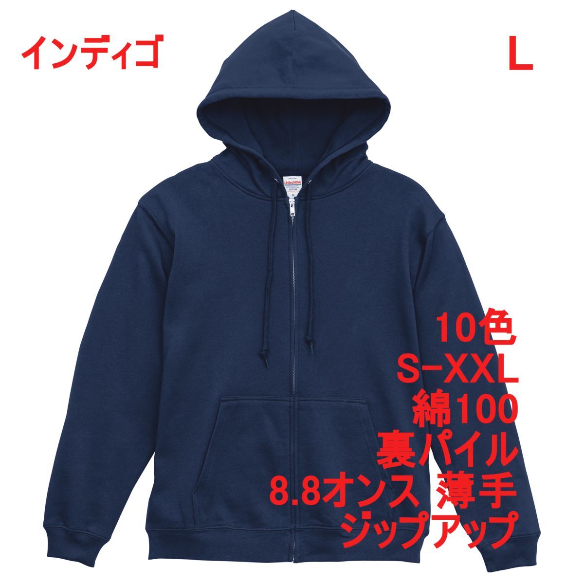 - パーカー L インディゴ 薄手 8.8オンス 裏パイル ジップアップ フルジップ 無地 定番 シンプル スウェット A2146 ネイビー 紺 紺色 539701