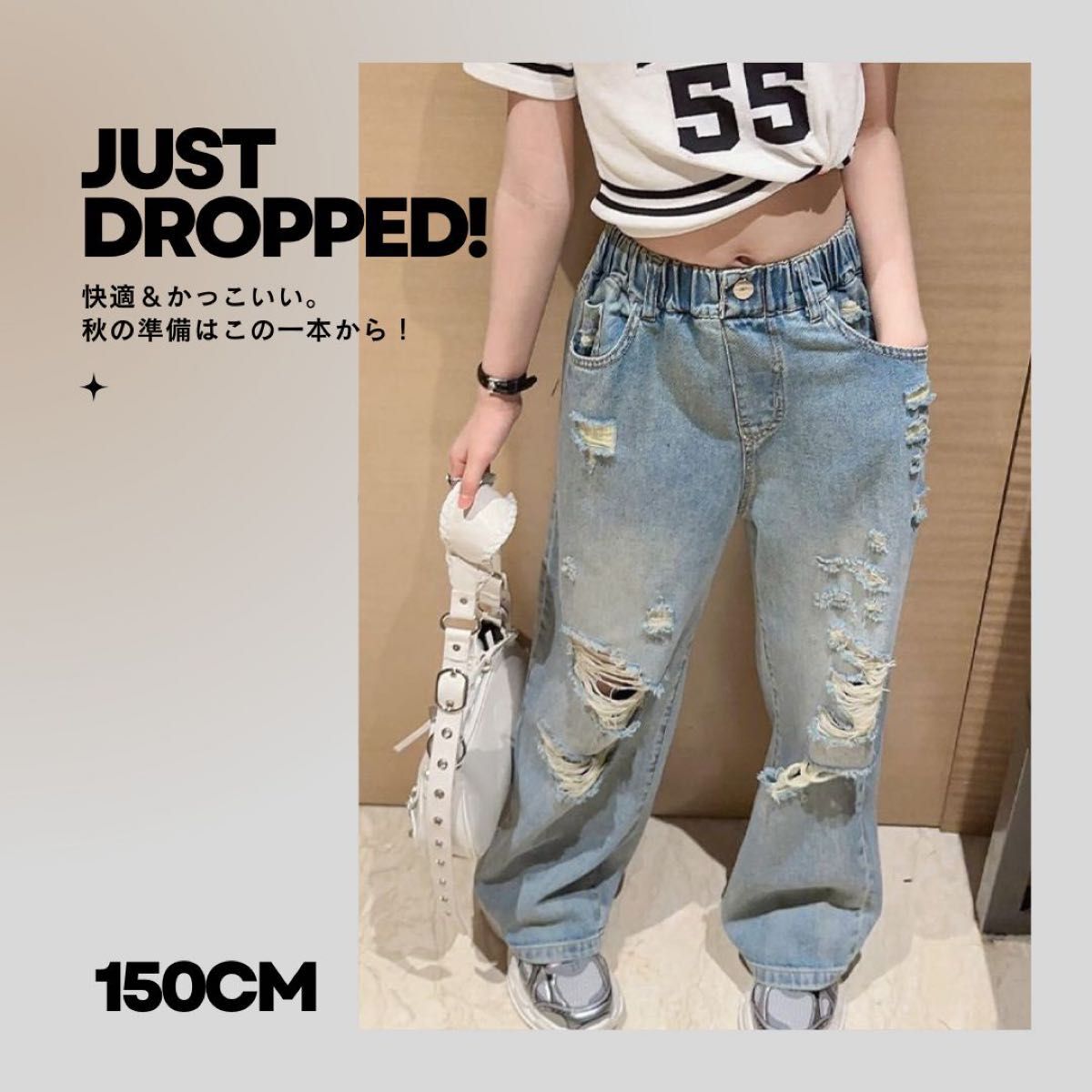 - 【150cm】女の子 デニムパンツ ダメージ加工 ゆったり