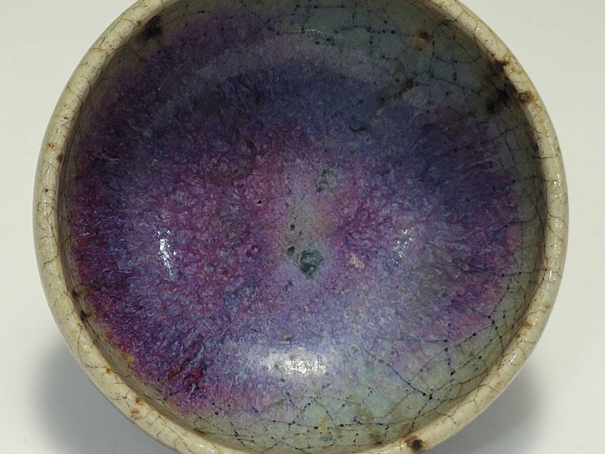 - ● 幅 約 5.5cm 空色釉薬の中の紫色で赤く染まった窯変が美しい 時代唐物 均窯 天釉 紫紅斑窯変 茶杯・宋元時代 盃 小碗 杯 盞 小鉢 ●