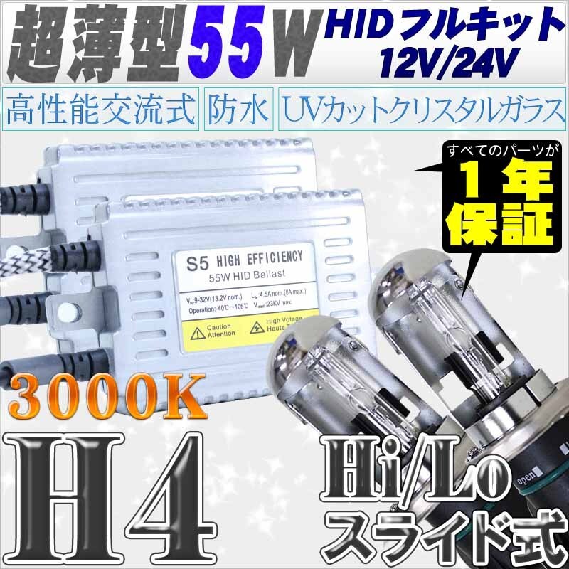 > 高性能 薄型HIDキット 55W H4 Hi/Lo スライド式 リレーレス、キャンセラー付 3000K 12V/24V 【交流式!高級HIDキット】