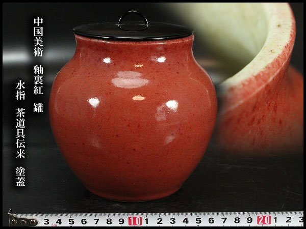 > 【金閣】中国美術 釉裏紅 罐 水指 茶道具伝来 塗蓋 φ15cm 旧家蔵出 送料無料(F63)