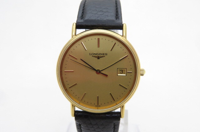 > 1円~【動品】LONGINES ロンジン L4.636.2 GOLD ELECTROPLATED 10 メンズ クオーツ 腕時計 デイト 純正 ブラックベルト 9-13-1