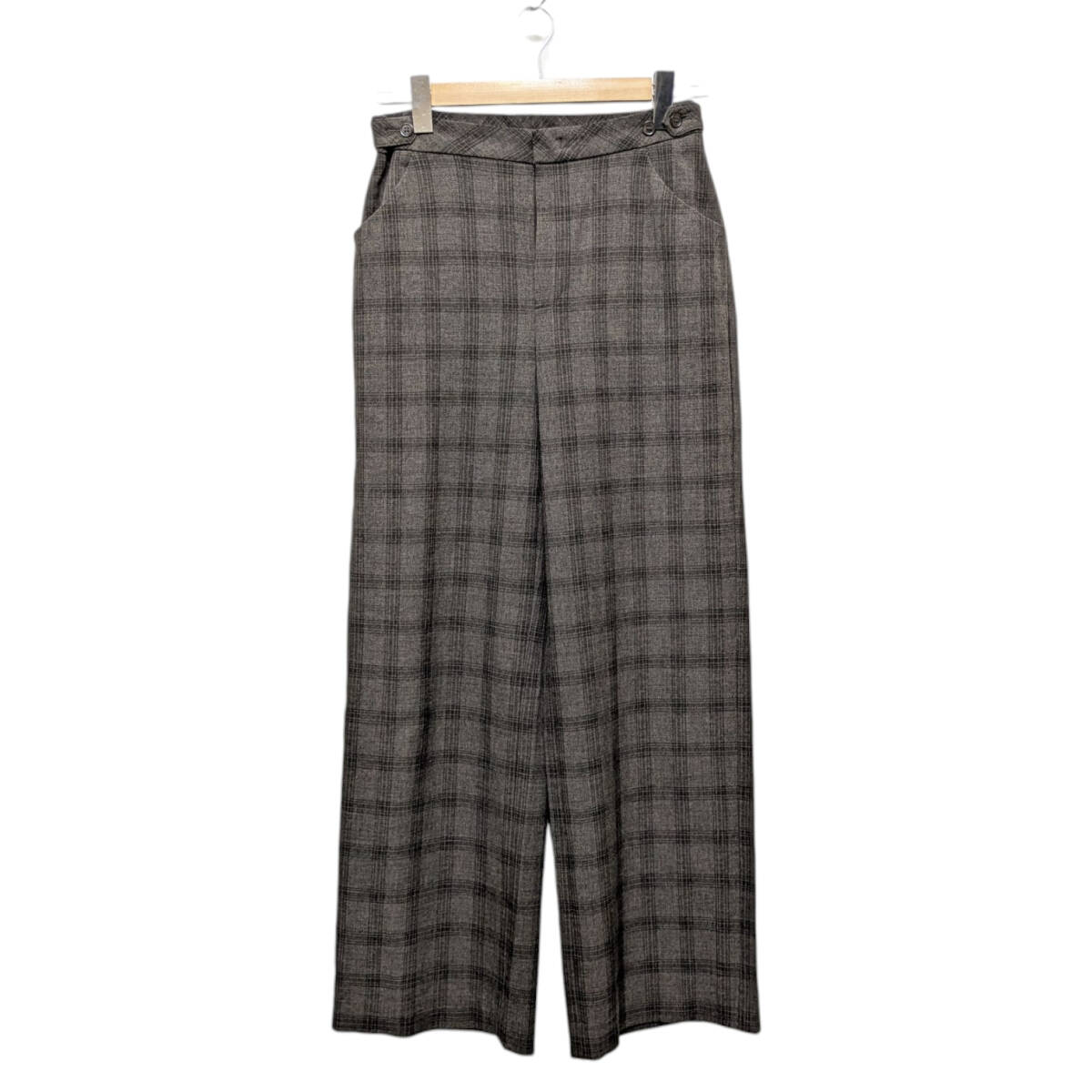> 未使用品 B-3 B-THREE ビースリー 770454 ドライウーリー ワイドパンツ サイドボタンチェックパンツ ブラウン系 サイズ L