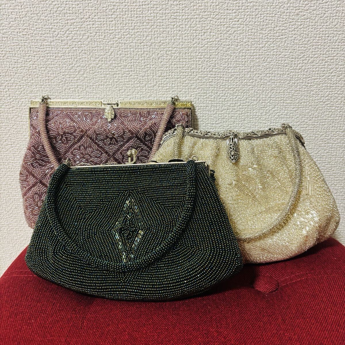 > 和装小物 和装バッグ ビーズバッグ まとめて3点 ハンドバッグ 総ビーズ 花 流 ホワイト 白色 ヴィンテージ がま口 昭和レトロ 和装小物 ③
