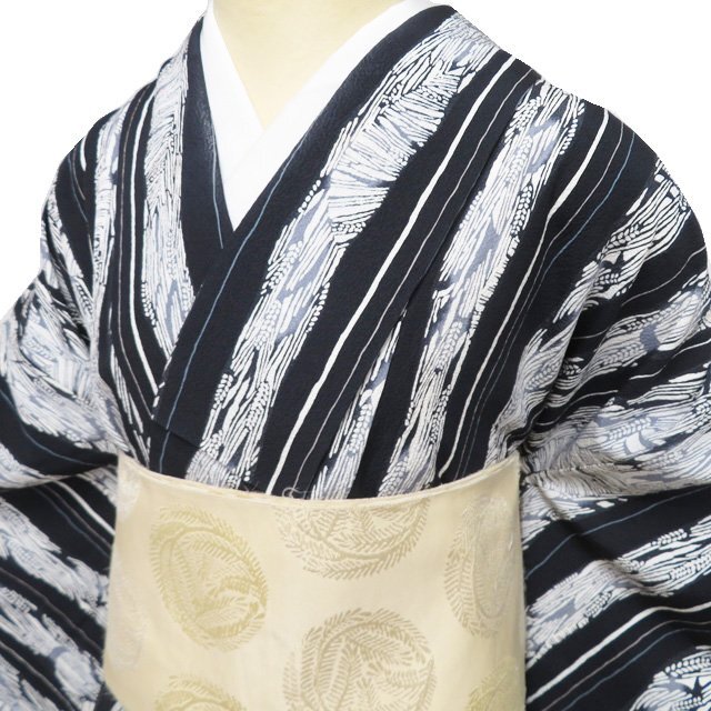 > 小紋 着物 中古 正絹 袷 カジュアル 縦段模様 稲穂模様 黒色 多色 身丈169cm 裄68.5cm L トール きもの北條 A1282-10