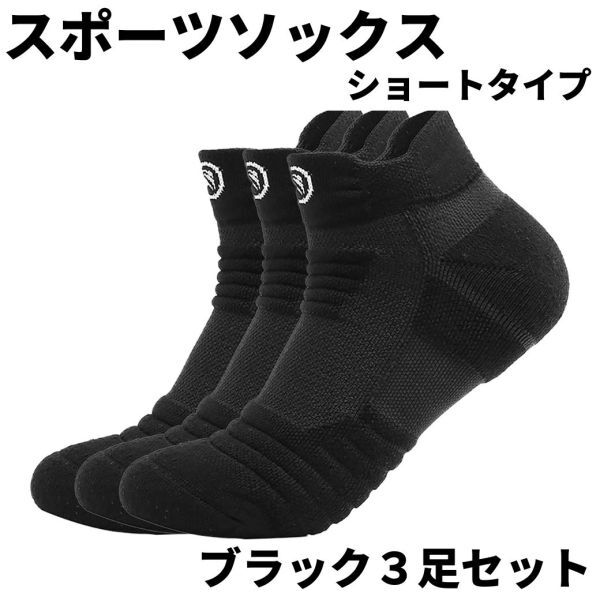 > スポーツソックス 3足セット メンズ 靴下 くつした ショート くるぶし 滑り止め 衝撃吸収 厚手 ランニング マラソン 黒 ブラック 新品