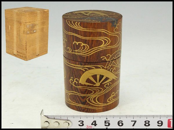 - 【金閣】茶道具 木地 流水御所車蒔絵 中次 棗 時代物 美品 旧家蔵出 送料無料(XA858)