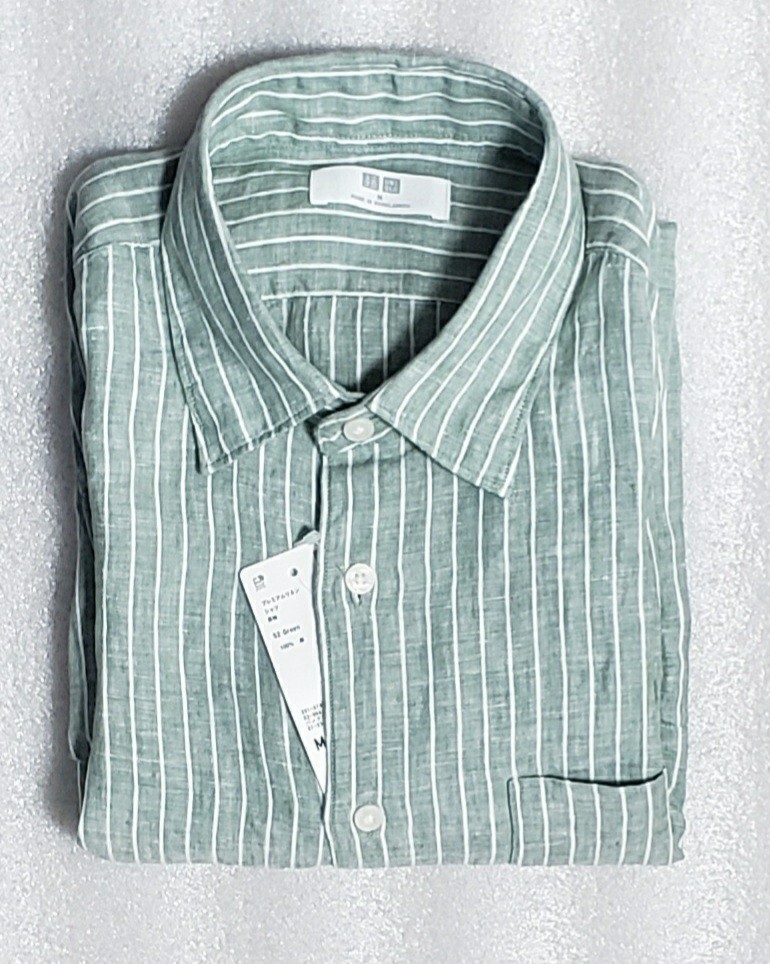 - Mサイズ 新品 ユニクロ プレミアムリネンシャツ ストライプ グリーン 麻100% UNIQLO 長袖シャツ 左胸ポケット ヨーロッパリネン 送料無料