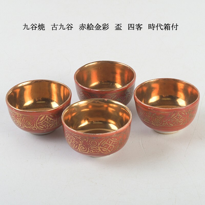 - 九谷焼 古九谷 赤絵金彩 盃 四客 時代箱付 CXHE