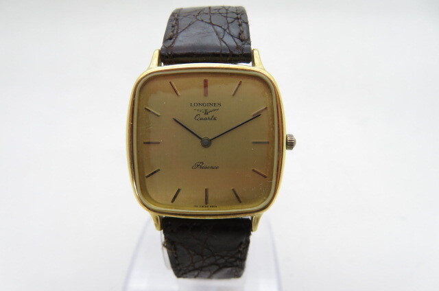 - 1円~【動品】LONGINES ロンジン Presence プレザンス 150 SWISS 6803 メンズ クオーツ 腕時計 スクエアフェイス ブラウンベルト 9-14-20
