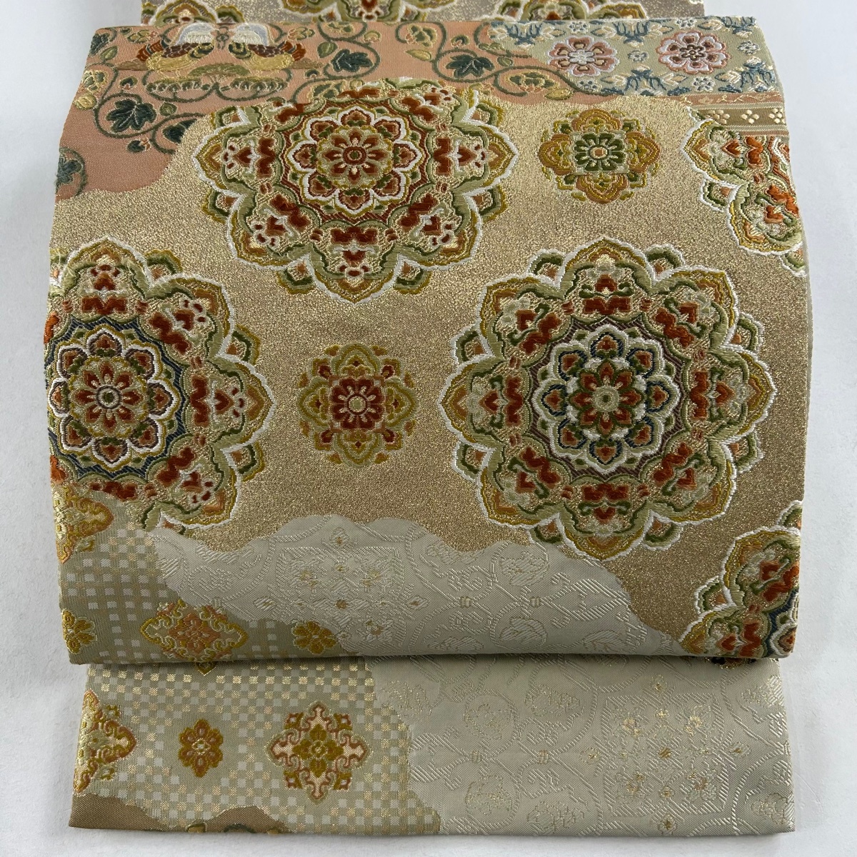 - 袋帯 美品 秀品 華文 向かい鳥 金糸 唐織 ベージュ 六通 正絹 【中古】