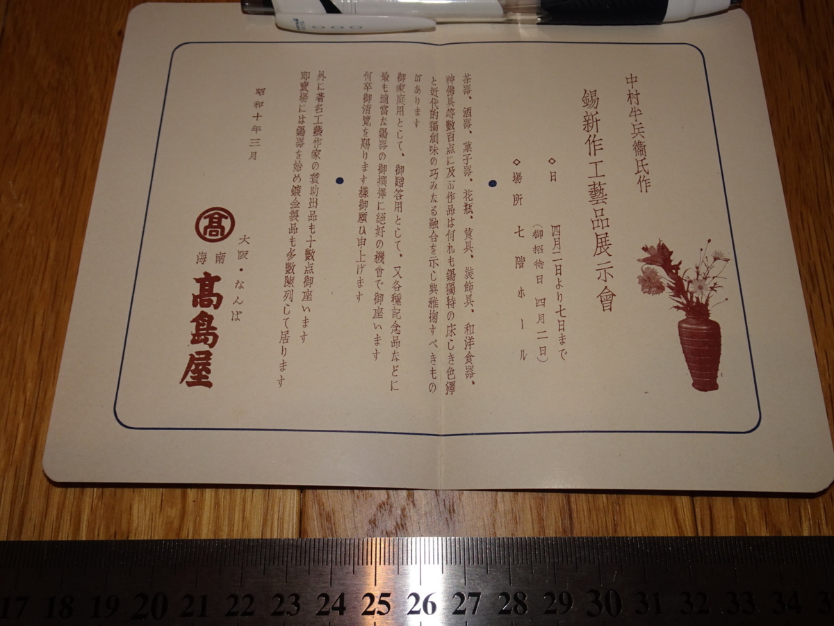 - Rarebookkyoto o719 高島屋美術部 中村半兵衛 錫新作工芸品展覧会 案内絵葉書 大阪店 1939年頃 名人 名作 名品