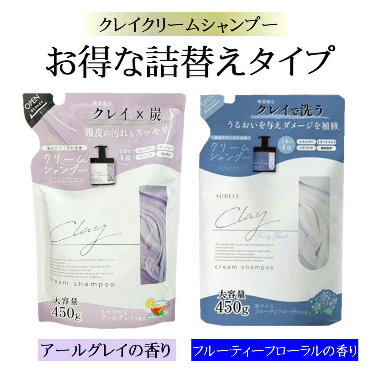 - 日本製 【詰替え 2本 アール フルーティー】クレイ クリーム シャンプー 450g クリームシャンプー クレイクリーム 1本4役 【日本製】B