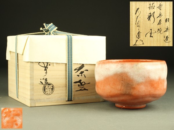- 【宇】1648 三代 佐々木松楽造 赤茶碗 銘「彩雲」大徳寺 矢野一甫 書付 共箱 茶道具