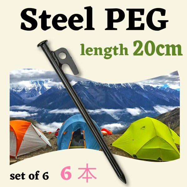 - 送料無料 スチールペグ ペグ スチール製 6本 20cm 高強度 引抜穴付きペグ テント タープ 設営 キャンプ DIY BBQ 野外フェス バーベキュー