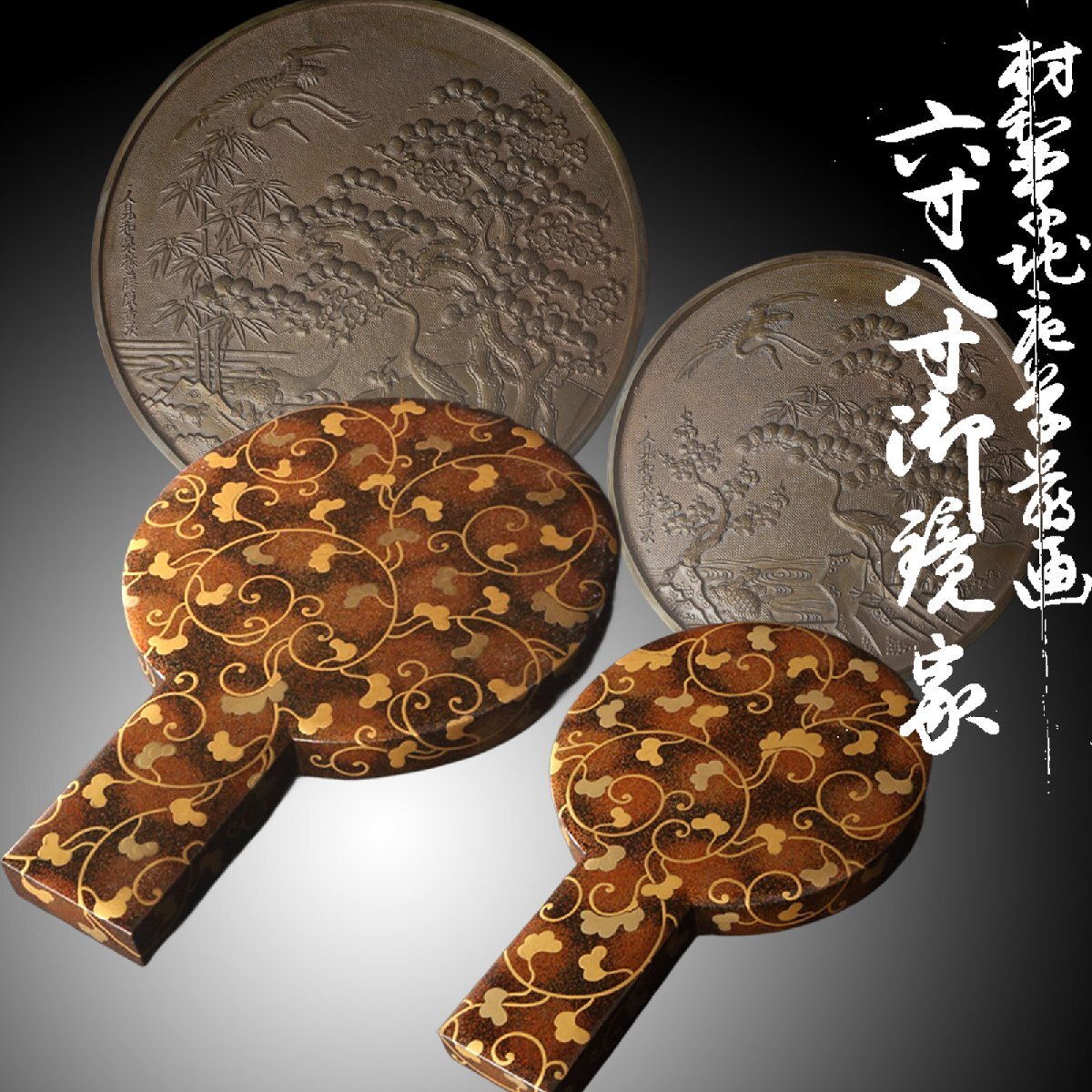 > 【深和】江戸中期◆幕府御細工所 村梨子地唐草蒔絵御鏡家 一双 人見和泉掾銘 蓬莱文六寸八寸柄鏡添(和鏡 古民具 金蒔絵 蓬莱鏡 柄鏡箱)