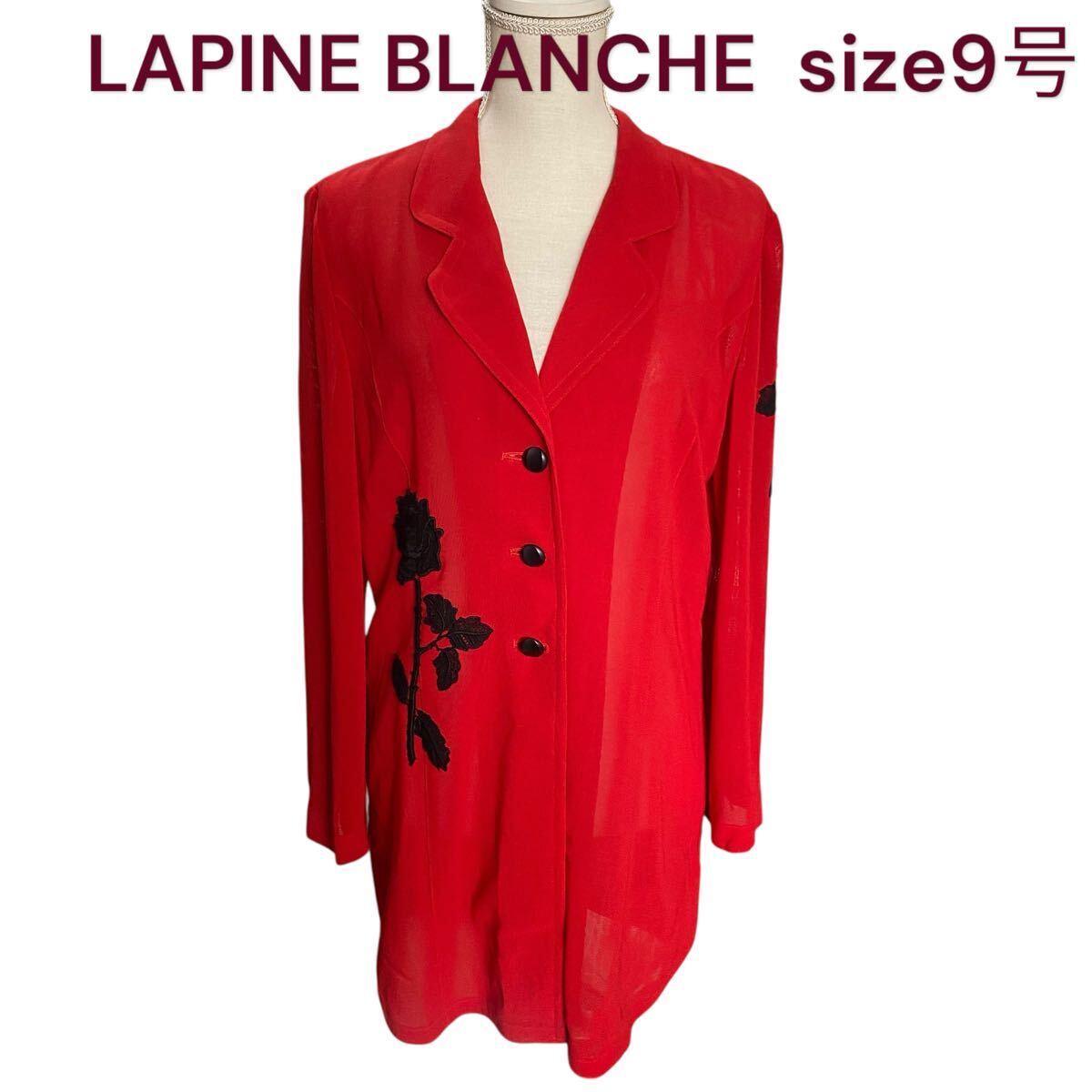 - 美品 ラピーヌ ブランシュ 花柄刺繍 薄手ウール ロング ジャケット 9号、M LAPINE BLANCHE 赤、レッド