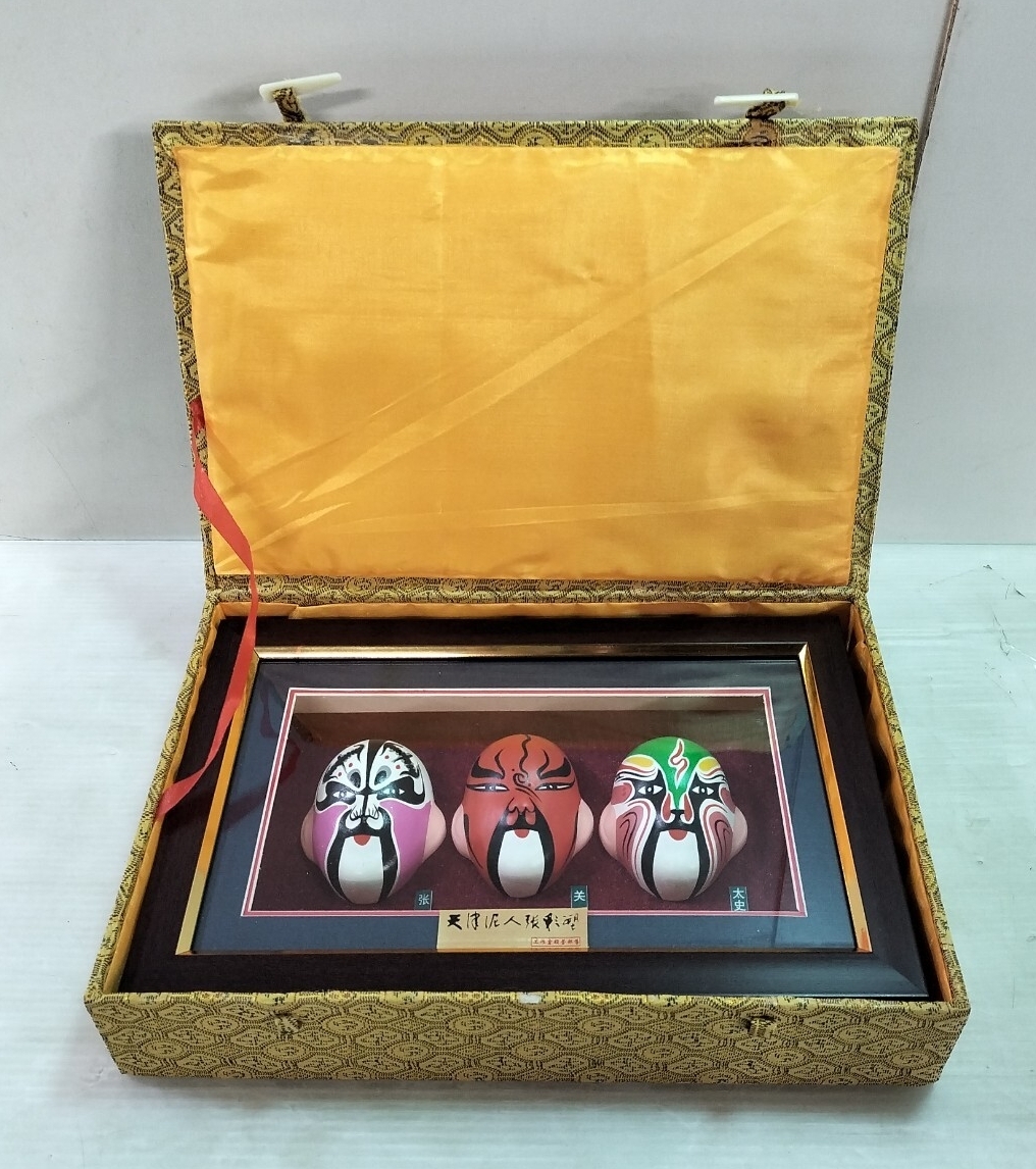 > P/天津泥人形彩塑/泥人形/福禄寿喜 お面/3種/額入り/箱物/インテリア 中国古玩/箱付き/P9.22-3鳥