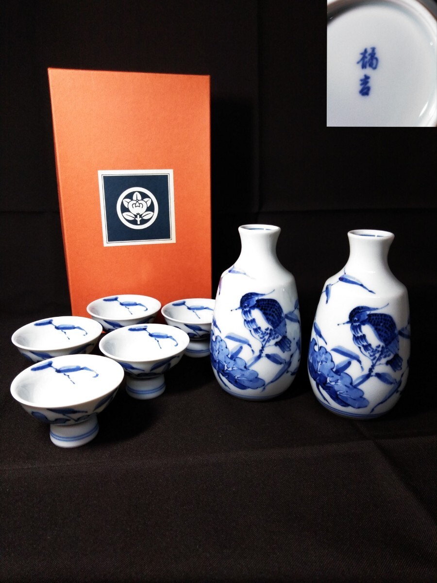 > 京焼 橘吉 酒器セット 青花 水鳥 徳利 酒盃 在銘 染付 (検索) 杯 盃 酒瓶 銚子 たち吉 陶器 熱燗 日本酒 会席 懐石 猪口 酒道 料理 在印