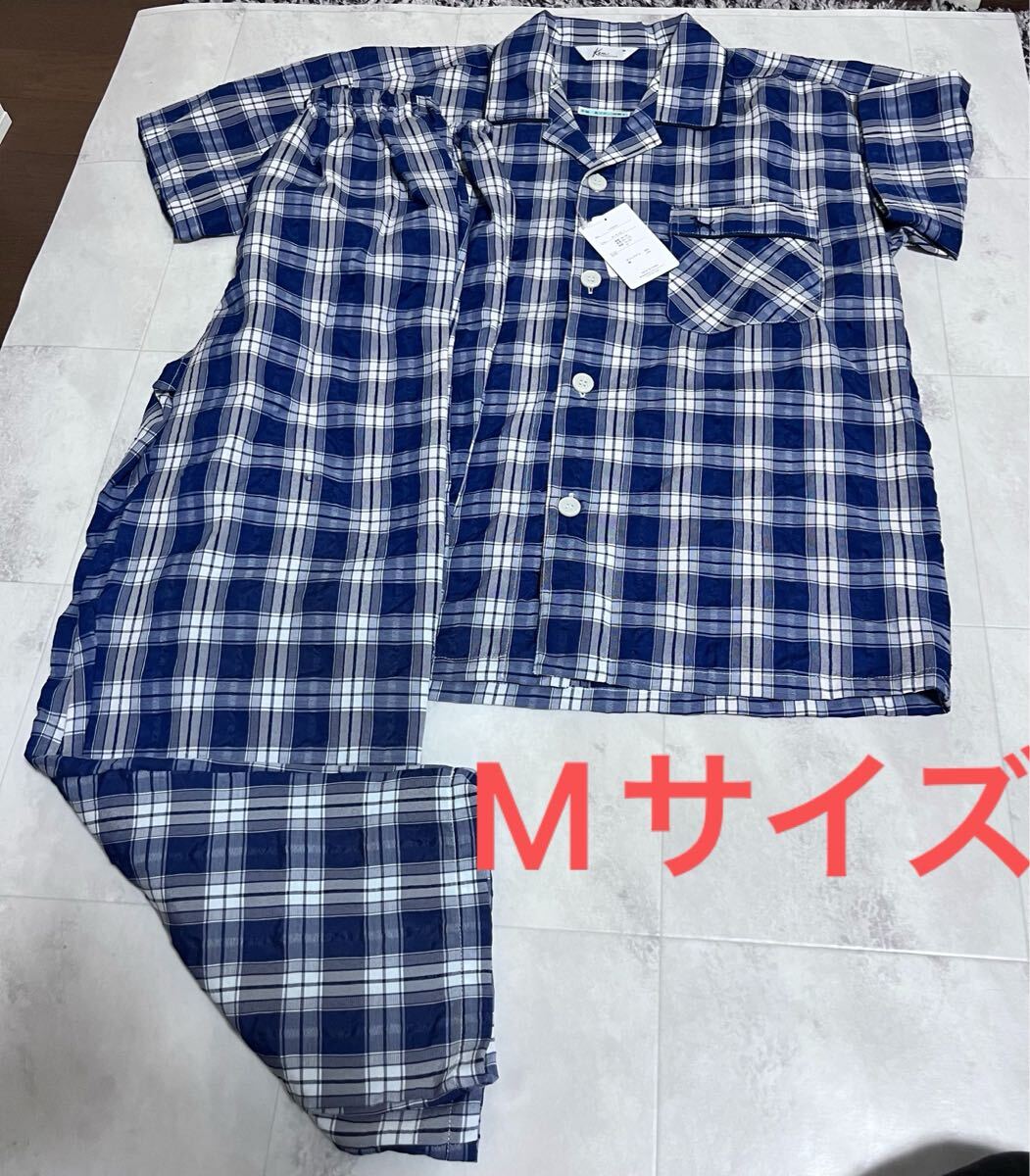 > 新品 Keu COLLECTION サッカー生地 紳士パジャマ(前開き) セットアップ 上下セット 犬刺繍 胸ポケット Mサイズ 前あき 入院 介護