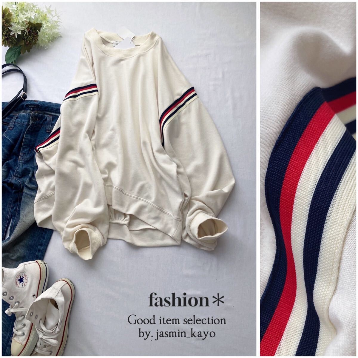 > ◆新品4L~3L/LL◆素材変えた赤紺ライン配色テープ*心地よい綿混スウェット カットソー素材*ゆったり前後差tops*アイボリー系