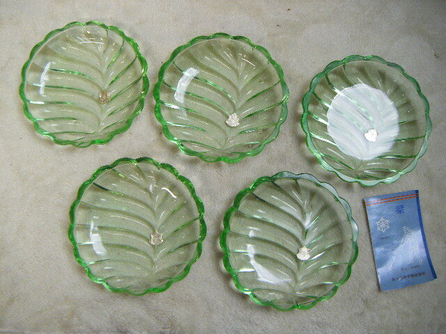- 昭和レトロ 佐々木硝子 緑ガラス ミニトレー ガラス皿 プレート 5枚セット 葉模様