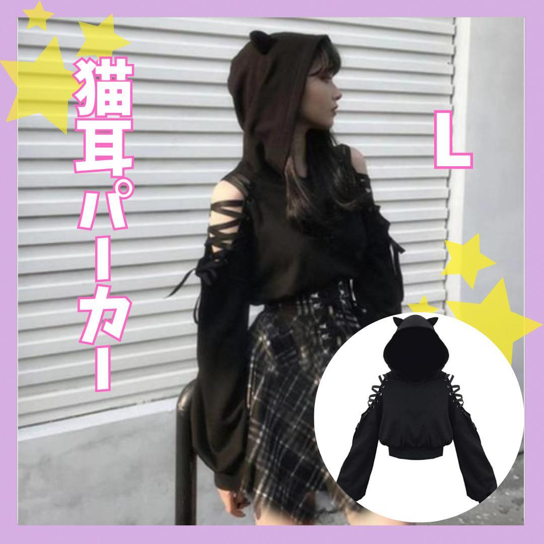 - L【新品】猫耳パーカー 肩出し リボン 地雷系 ショート丈 黒 ブラック 防寒 黒 裏起毛 ブラック 猫 おしゃれ 原宿系