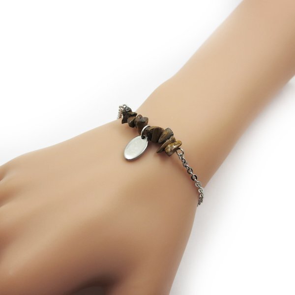> ステンレスチェーンブレスレット タイガーアイ&チャーム付き 2.4mm幅 全長約20cm(17+3cmアジャスター)
