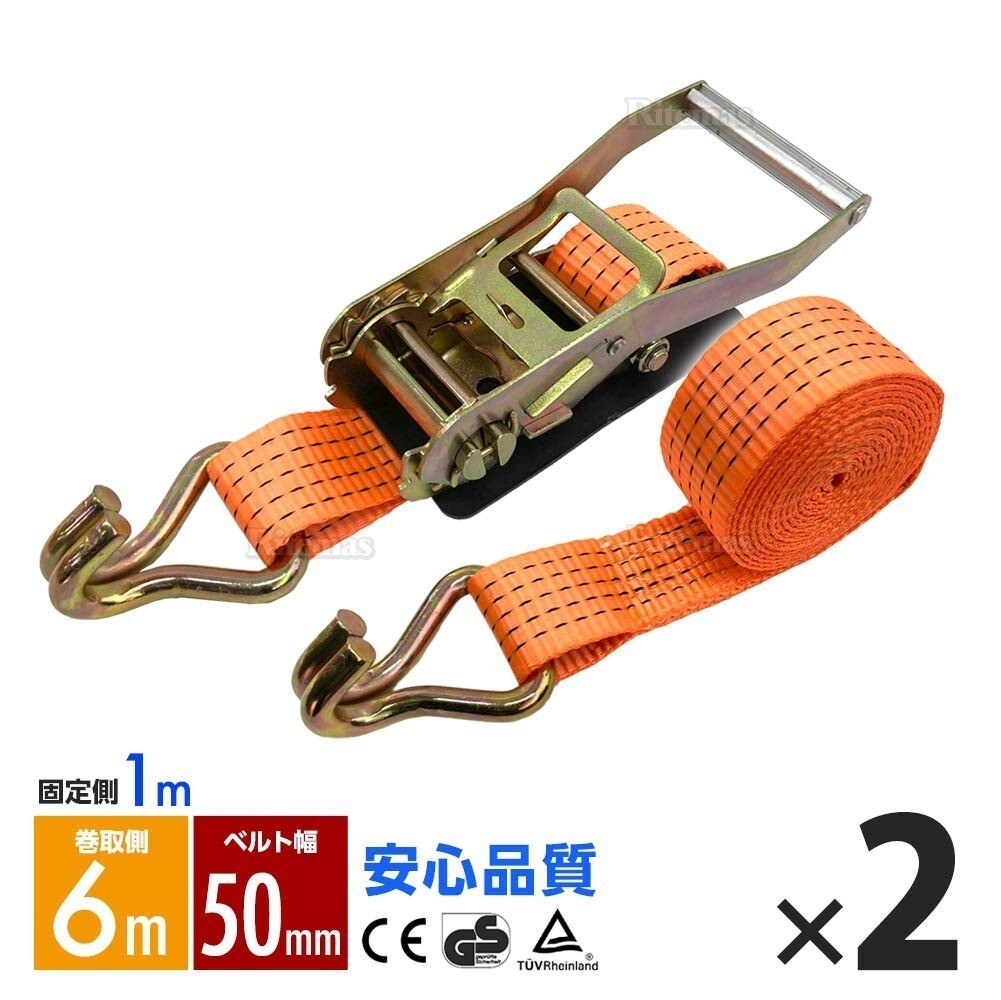 > ラッシングベルト フック トラック 幅 50mm ラチェットベルト ラチェット式 固定側1m 巻側6m 荷重4000kg タイダウンベルト 2本set 1年保証