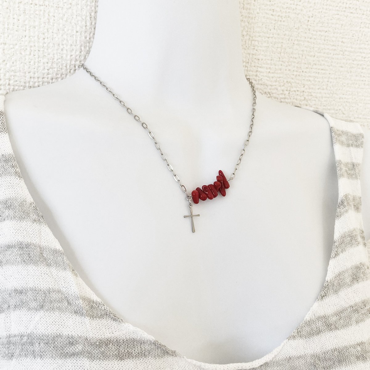 - ミニクロスチャーム パワストーンステンレス 山サンゴ 約4mm玉 ネックレス 2.5mm幅40cm ST82