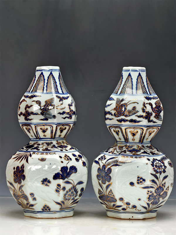 - yfa|0236 中国磁器 陶芸 磁器『【大明宣徳】青花蒔金暗飾刻磁鳳凰魚紋瓢瓶(ひょうたんびん)』施釉陶 古代工芸品 陶芸 精美彫 置物 收藏品