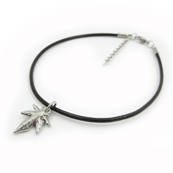 - レザー 革紐 アンクレットマリファナチャーム付き ステンレス金具 27cm(23cm+4cmアジャスター)