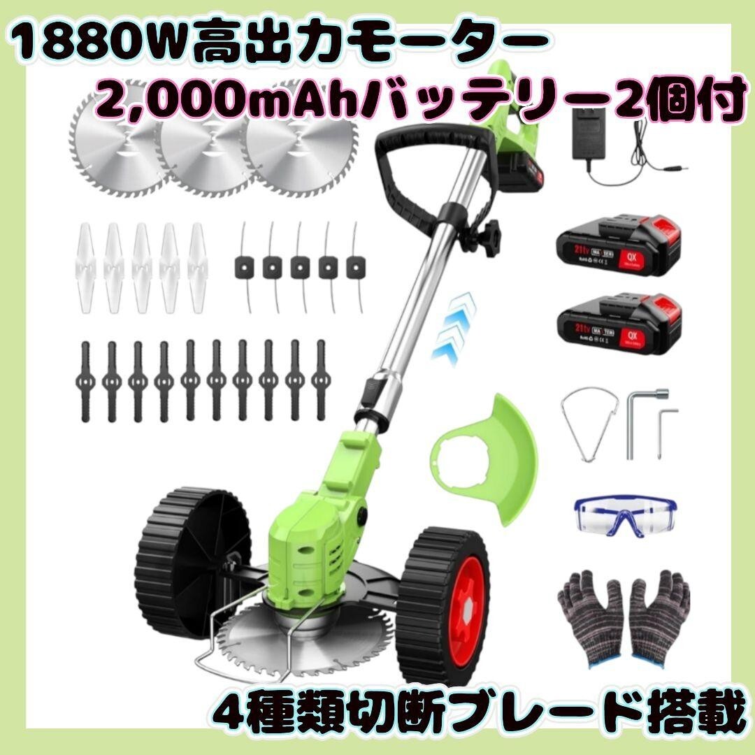 - 草刈り機 充電式 高性能 4000mAhバッテリー総容量 1880W 補助ホイール 伸縮可 角度調整可 多替刃付 農業 家庭用