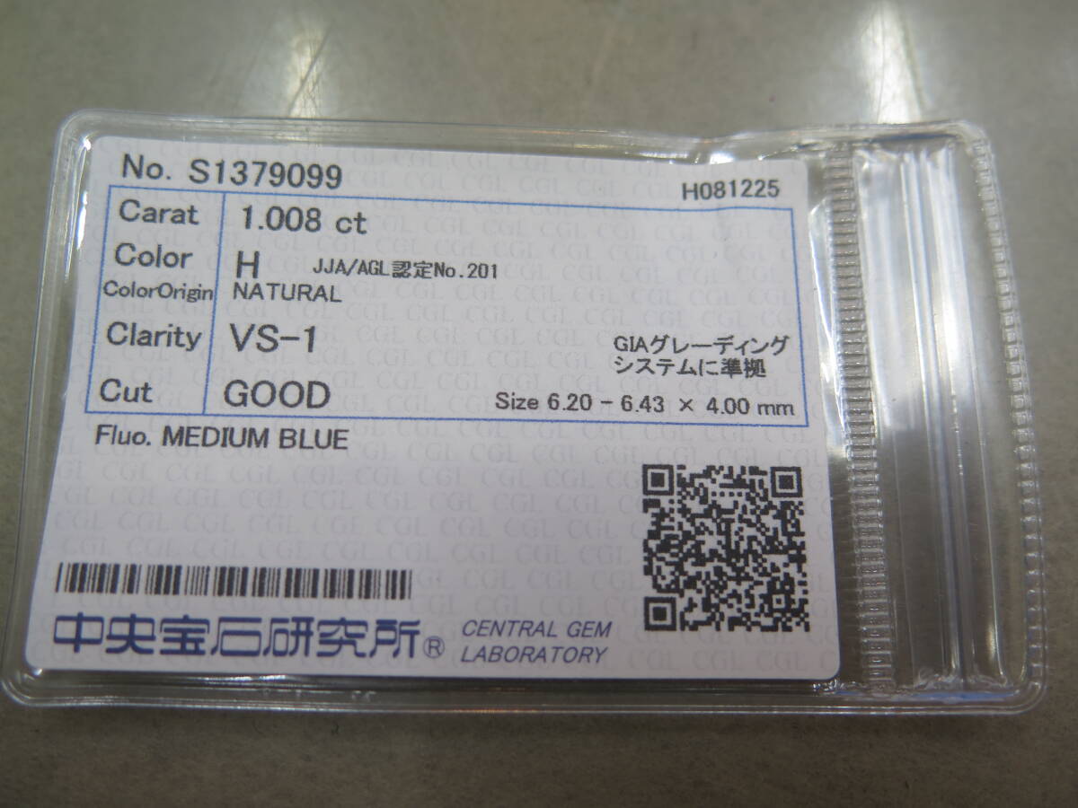 - ダイヤモンド ルース 1.008ct Hカラー VS-1 GOOD