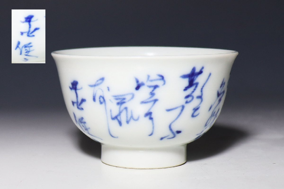 - 【桃】酒器ぐい呑み:染付詩文人物図猪口