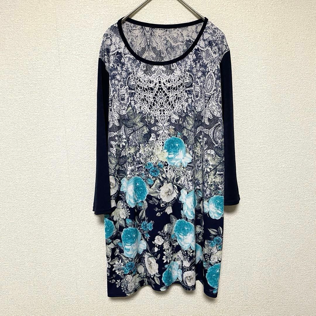 - zo297 ストレッチ伸縮性カットソー/7分袖チュニック/ネイビー無地×花柄
