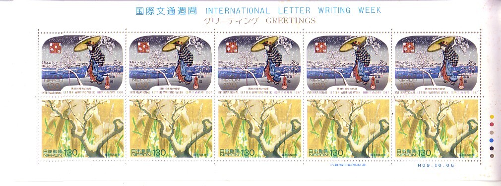 - 「国際文通週間1997 隅田川堤雪の眺望/四季花鳥図巻」の記念切手です