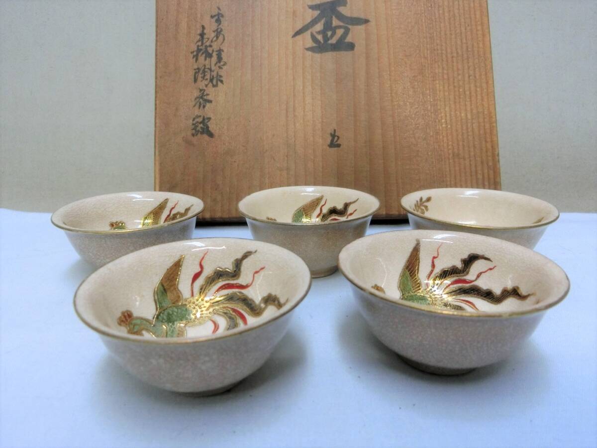 - 使って!【盃 酒盃 5客組 箱入り 金彩色絵鳳凰文 清水焼 酒器 】◆ぐいのみ 徳利 コレクション 鑑賞陶磁器 収集