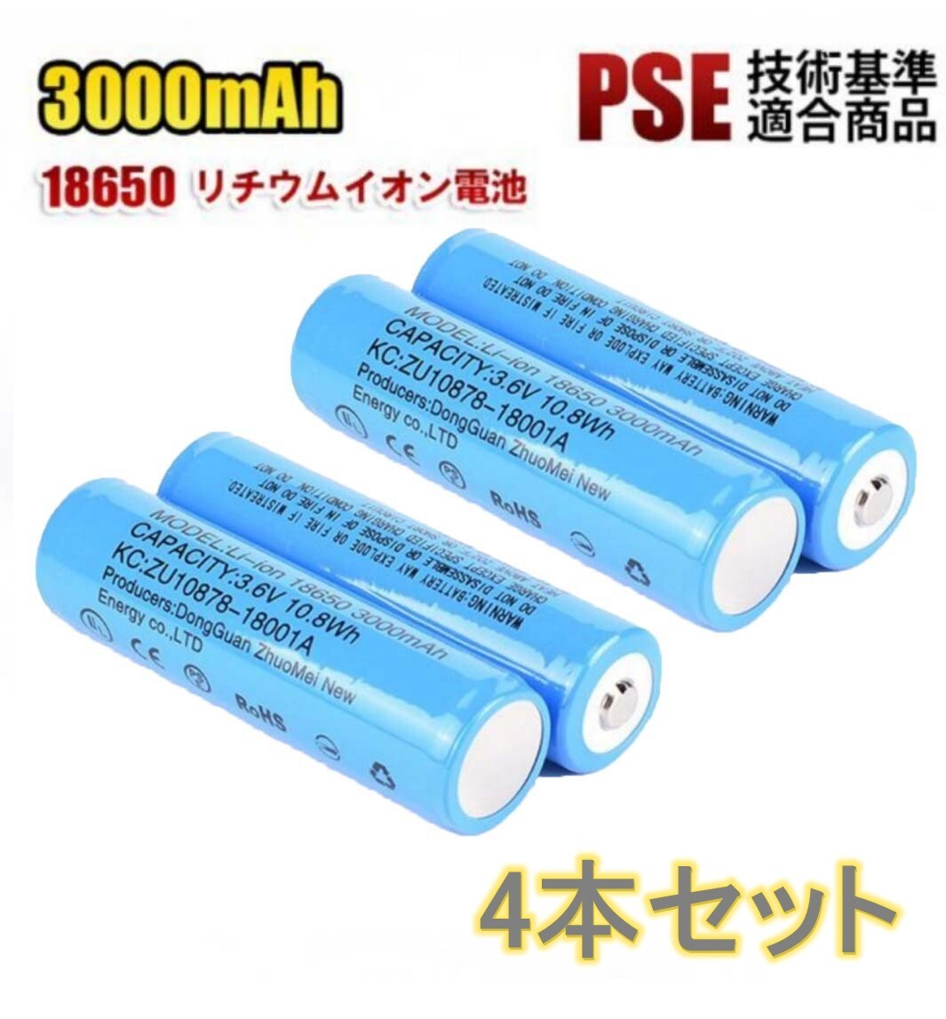 - 【4本セット】18650 リチウムイオン電池 バッテリー 高容量 3000mAh 3.6V PSE認証