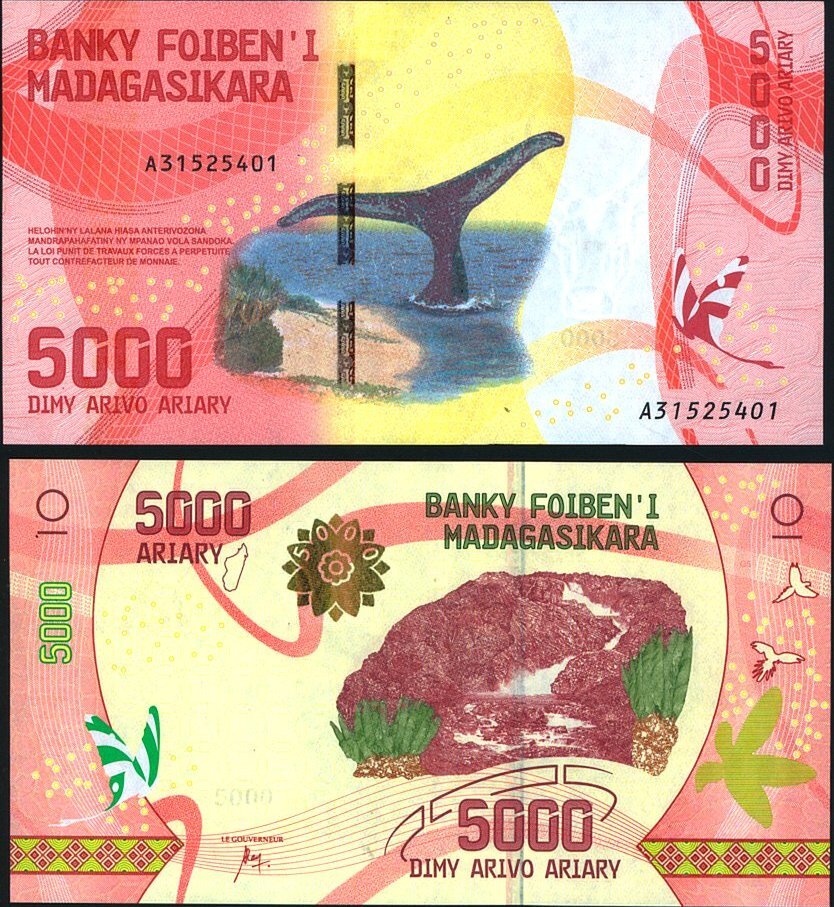 - (B-1306) マダガスカル 5,000アリアリ紙幣 2017年 クジラ ④
