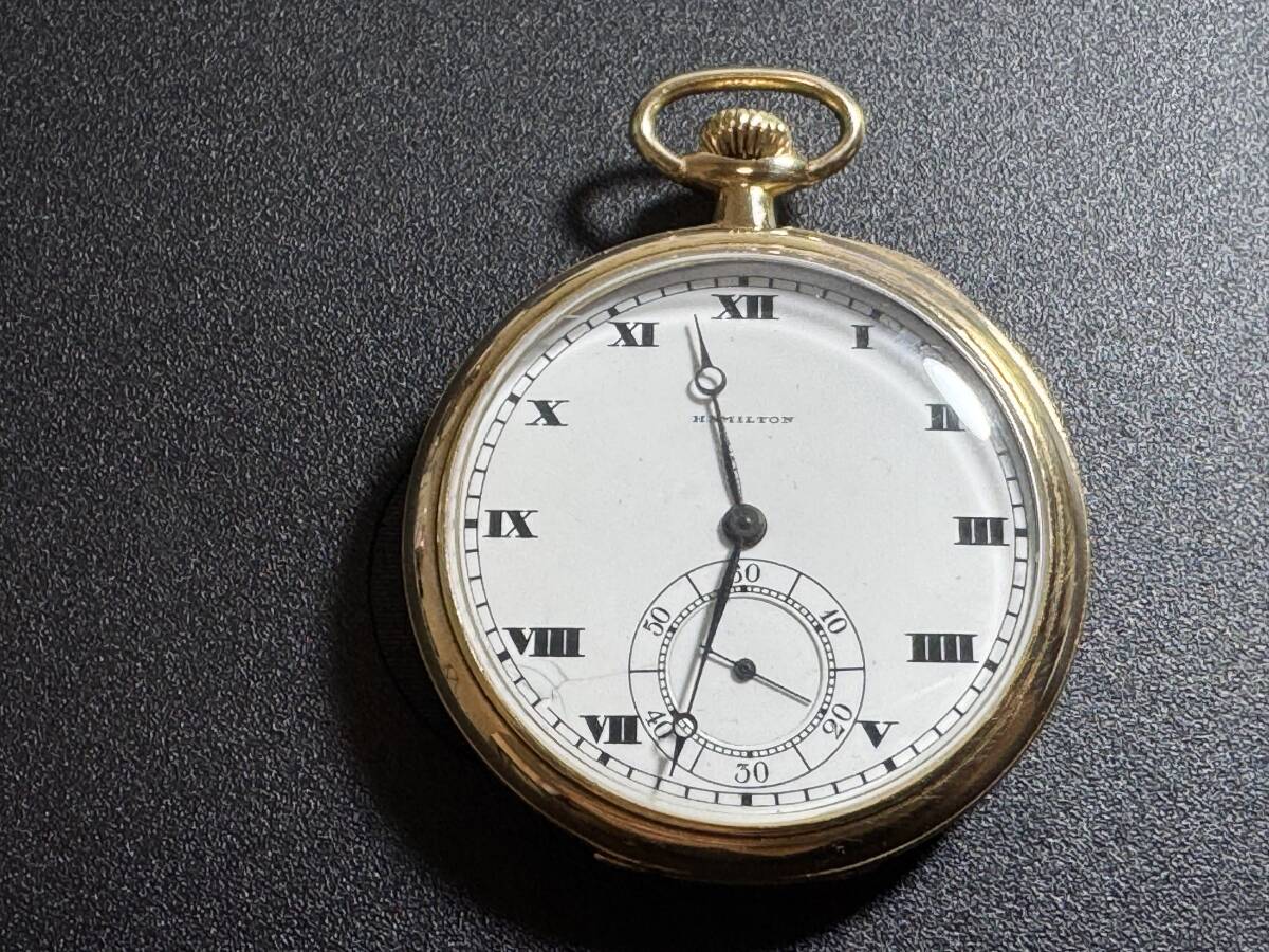 > ◎GINSO◎14金無垢ハミルトン懐中時計 63.42グラム・直径は46.2mm(リューズ高を含まず)日差-10秒で正確に稼働中です。