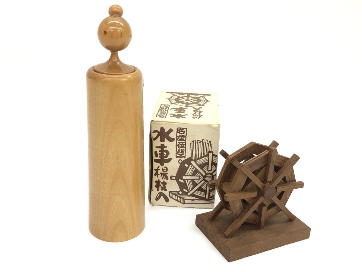 - 保管品 木製 銘木 一位 イチイ 水車型 爪楊枝入れ 箱付/女の子 こけし型 爪楊枝スタンド 面白い キッチン雑貨 キッチン用品 木工芸 2点